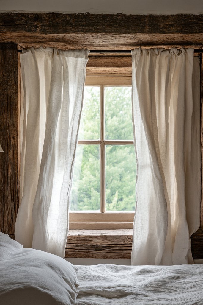 Windows are often overlooked but can be transformed into focal points with the right treatment. Rustic wooden frames paired with simple linen curtains bring natural light and rustic charm together effortlessly.