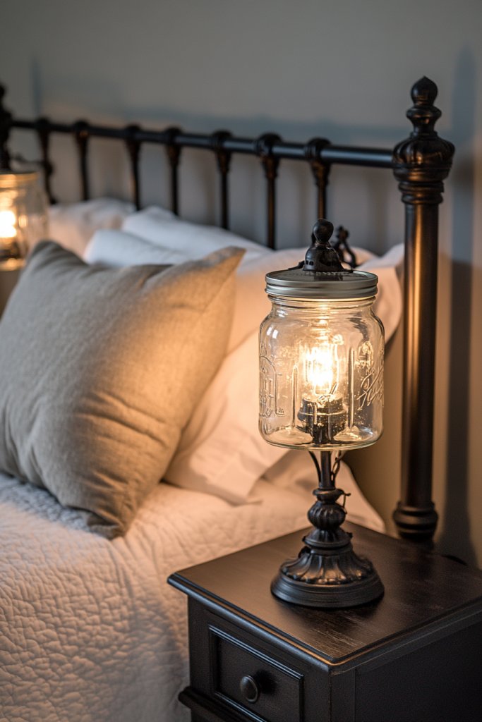 16. Wrought Iron Bedside Lamps with Mason Jar Shades