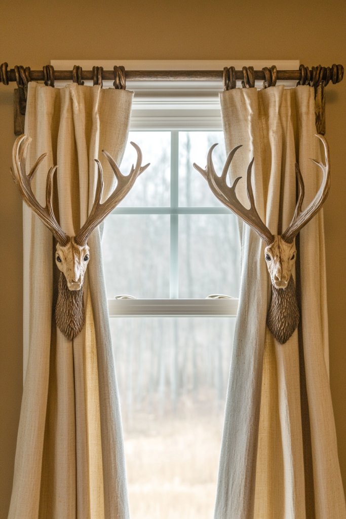 Picture faux antler hooks or leather strap tiebacks holding back linen or burlap curtains. The natural curves and textures mimic real antlers, adding rustic authenticity.