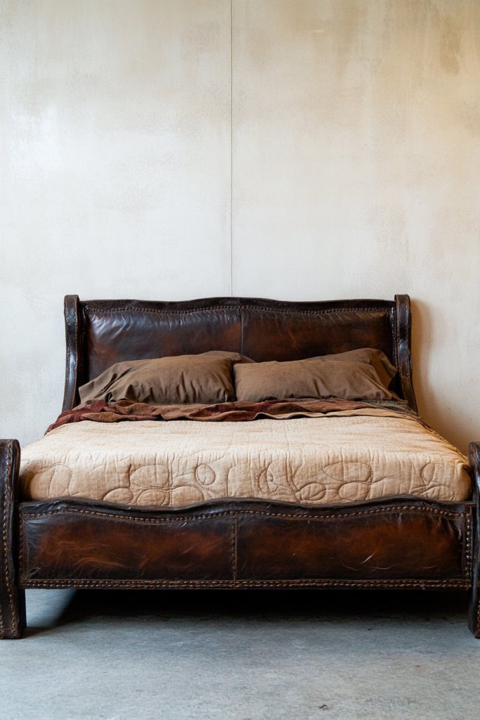 Incorporate Western motifs like conchos or metal studs along the frame. Use textured bedding—think chunky knit throws or plaid patterns—to complement the leather’s rugged look.