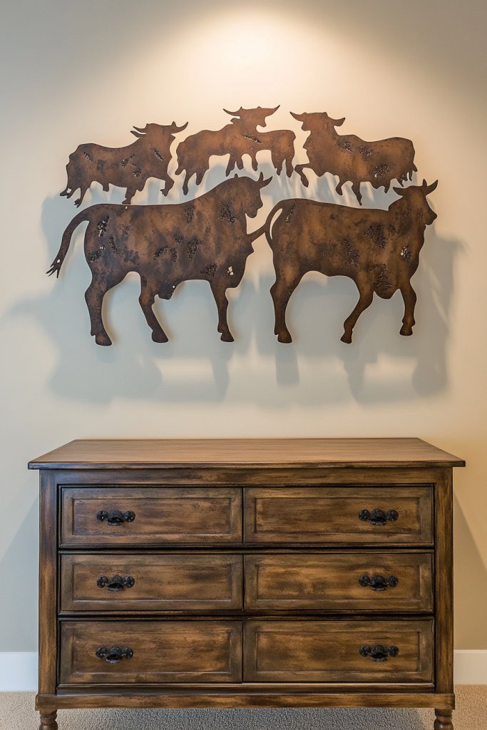 Searching for a bold way to express your love for Western life? Rustic metal wall decor featuring horses or cattle can be just the statement piece you need. It adds visual impact and personality to any space, making your bedroom stand out.