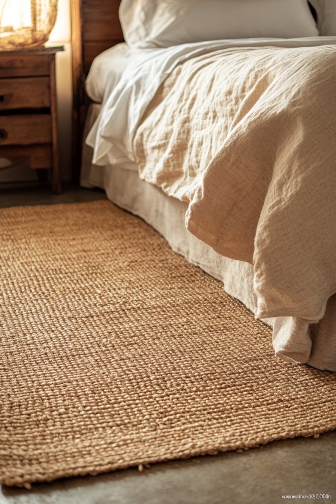 Is your bedroom missing that cozy, grounded feel? An area rug made from woven jute or sisal can transform the space, adding warmth and texture. It’s a natural way to complement rustic furniture while grounding your decor.