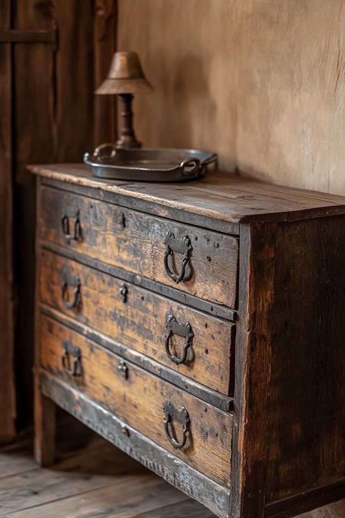 It’s the perfect piece to combine function with authentic charm. Visualize an aged wooden dresser with distressed paint and metal hardware.