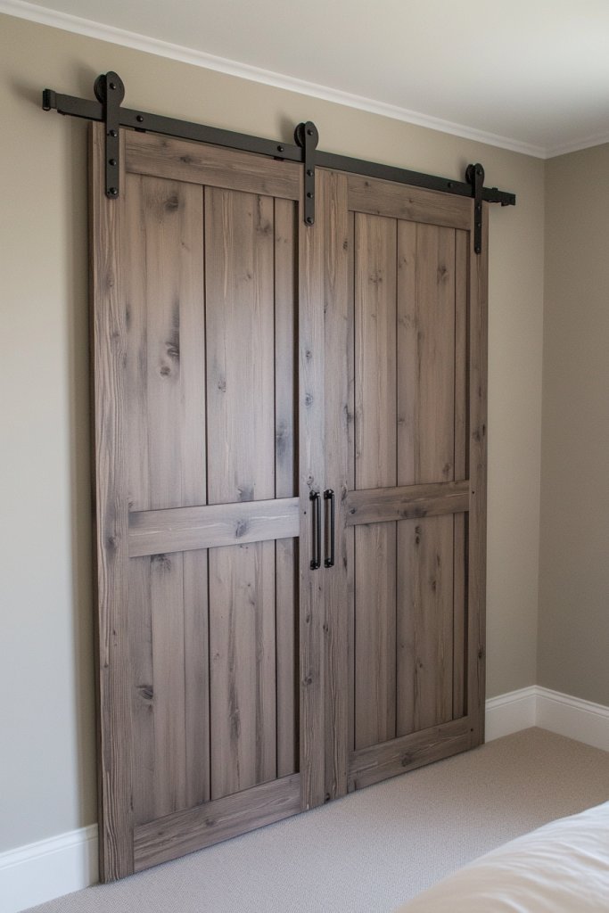 Imagine weathered wood panels sliding on black metal hardware, reminiscent of classic barns. The doors feature distressed finishes, with visible grain and knots that enhance authenticity.