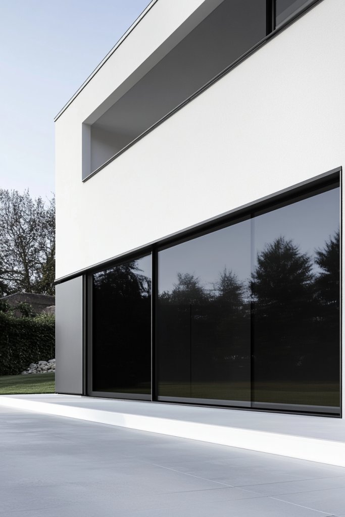 Visualize expansive black frames holding tinted glass that softly filters sunlight, creating a muted, sophisticated glow inside. The tint adds a subtle hue—blue, green, or gray—that complements the black frame and the white exterior. From outside, the tinted surface appears almost like a dark mirror, obscuring interior views while maintaining an undeniable style statement. This combination enhances the modern, refined character of your home.