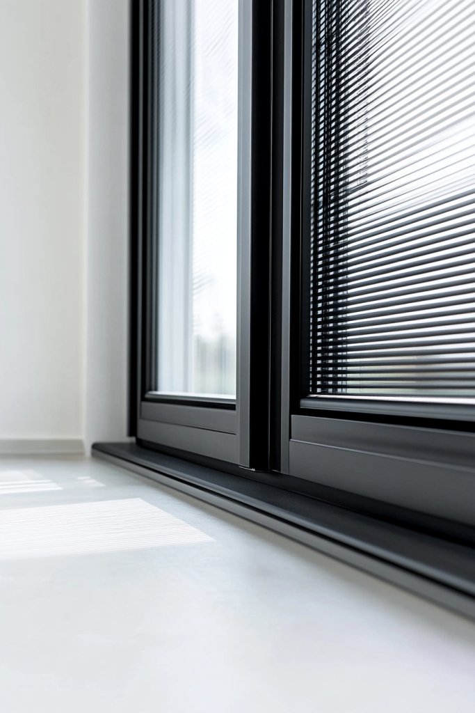 Imagine smooth black frames with internal blinds hidden within the window cavity. When closed, they create a seamless, monochromatic surface—like a piece of modern art. When opened, the slats tilt effortlessly, flooding your space with daylight. Inside, the clean lines and hidden mechanisms keep the view unobstructed and clutter-free, emphasizing simplicity.