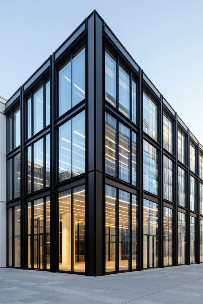 Use high-performance, structural silicone-sealed glass panels with durable black aluminum or steel framing. Professional installation is critical to ensure proper sealing, support, and alignment. Structural calculations must account for wind loads and weight, especially for large spans. Incorporate thermal breaks and double-glazing to improve insulation. Regular inspections and cleaning preserve clarity and structural integrity.