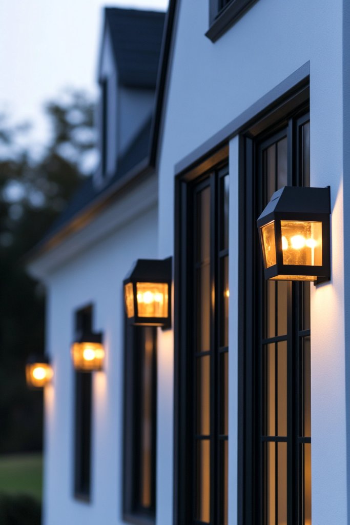 Picture subtle, hidden lights installed flush with the exterior wall, casting an upward or downward glow onto the black frames. The illumination accentuates the contrast against the white walls, creating a striking visual effect after dark. Inside, the warm glow filters through the glass, making your windows look like framed art pieces. The lighting adds depth and a sense of mystery to your facade.