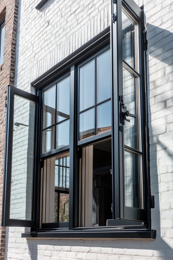 Visualize sleek black aluminum frames opening outward, revealing expansive glass panes with a subtle matte finish. The slim profiles maximize glass area, flooding your interior with natural light while maintaining a robust exterior presence. The texture of the aluminum contrasts beautifully with the white walls, adding a subtle industrial feel. At night, minimal hardware details or hidden hinges keep the look clean and uncluttered.