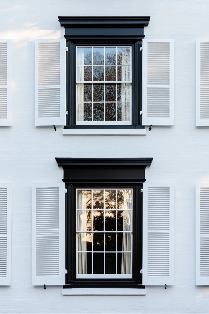 Imagine crisp black window frames accented with white shutters that swing open to reveal glimpses of the outdoors. The stark contrast creates a visual pop, drawing attention to architectural details. When shutters are closed, they frame the windows like a picture, adding depth and texture. The black frames provide a sleek outline against the white shutters, balancing old-world charm with a modern finish.