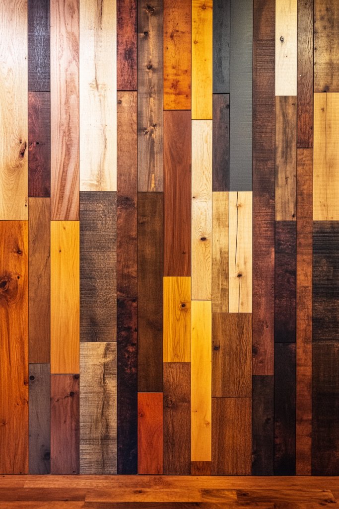 If your walls feel flat or uninspired, this approach provides a creative, high-end solution. Imagine framed sections of different wood grains and colors, layered in a staggered or grid pattern.