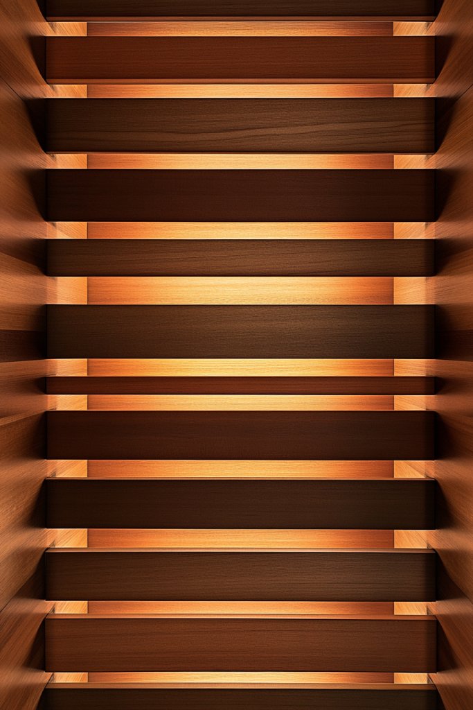The lighting casts a soft, diffuse glow that accentuates the vertical lines and adds a subtle ambiance. The natural wood tones combined with the warm light create a cozy yet contemporary atmosphere.