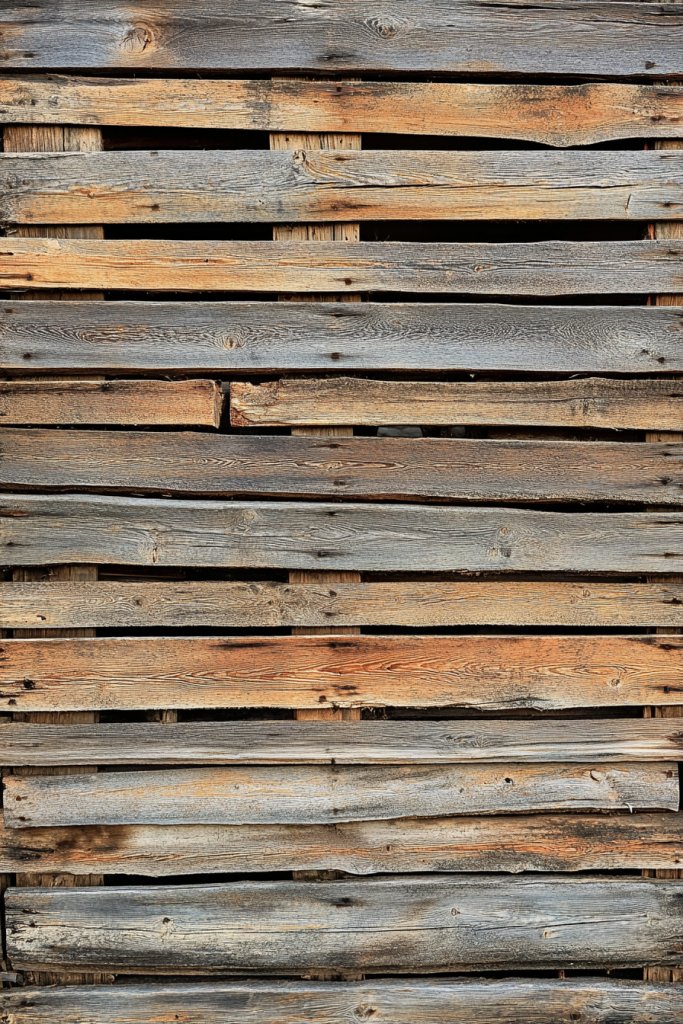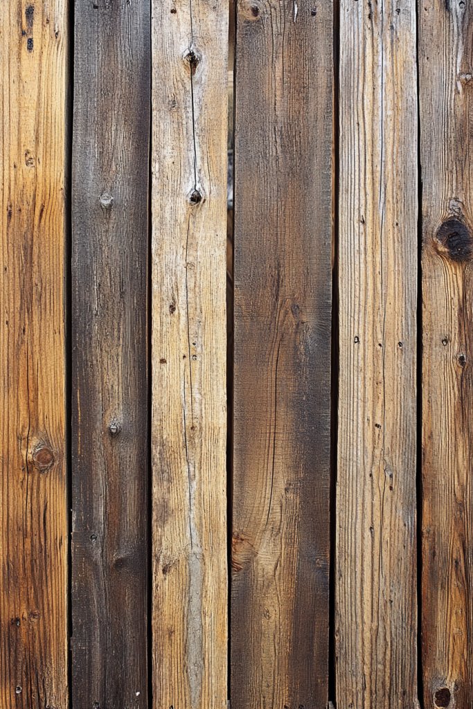 Imagine weathered, textured wood planks with varying shades of gray and brown, each piece carrying its own history. The rough-hewn surfaces add a tactile element, while the irregular edges give a handcrafted feel. The planks are arranged either horizontally or vertically, creating a layered, imperfect pattern. Sunlight filters softly through the gaps, casting dappled shadows that evoke a peaceful, countryside atmosphere.