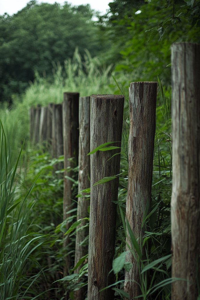 Picture tall, weathered wooden posts spaced irregularly, with gaps filled by tall reeds or grasses. The reeds sway gently in the breeze, adding movement and sound. The posts are left intentionally rough and unpainted, with some leaning slightly for a natural, overgrown feel. This creates a layered, textured boundary that feels like a part of the landscape rather than a barrier.