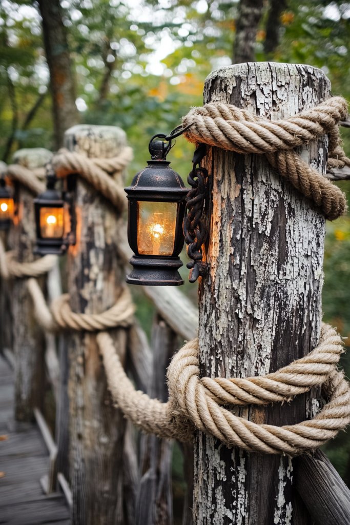 17. Weathered Fence with Rope Accents and Lantern Holders