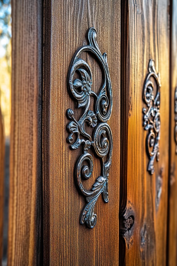Picture sturdy wooden panels in warm tones, punctuated by ornate iron inserts—perhaps floral motifs, scrollwork, or geometric patterns. The contrast between the rough wood and intricate metal creates a layered, sophisticated look. The metalwork catches light and adds a sense of craftsmanship and history. The overall effect is rustic elegance with a vintage vibe.