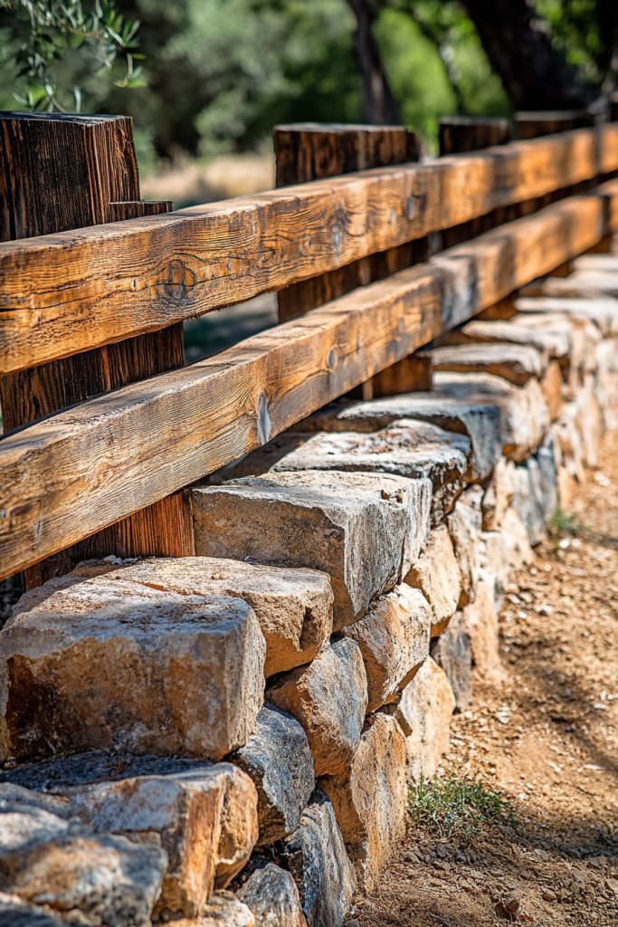 Lay a solid foundation for the stones—preferably with a concrete base or gravel for stability. Set the stones in place, ensuring they are level and secure. Attach wooden panels to posts anchored behind or within the stone bases, using corrosion-resistant fasteners. Seal the wood to prevent weathering, and periodically check the stability of the stones and panels. This project requires some masonry skills but results in a striking, durable boundary.