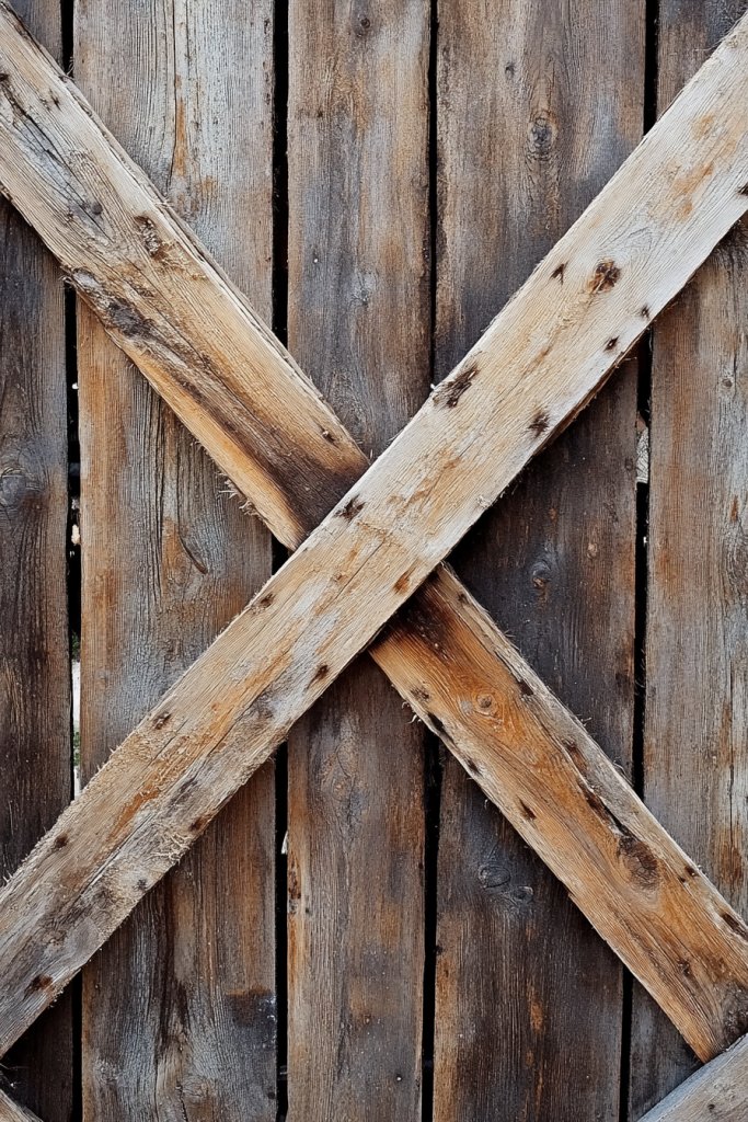 Visualize a series of reclaimed wood slats arranged in a diamond or crisscross pattern, creating a lattice-like effect. The weathered, mismatched wood adds charm and texture, with each piece telling its own story. Sunlight filters through the open spaces, casting intricate shadows that dance across your yard. The overall look is artsy, intentional, and full of rustic elegance.