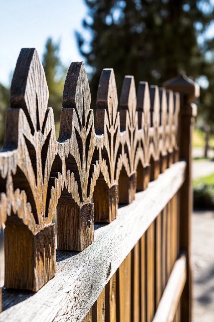 Seeking a fence that makes a bold statement? A tapered top fence with sunburst or arrowhead cutouts combines rustic charm with eye-catching design. It adds a touch of artistry and drama, transforming your yard into a standout feature. If you love architectural details and unique silhouettes, this idea will inspire you.