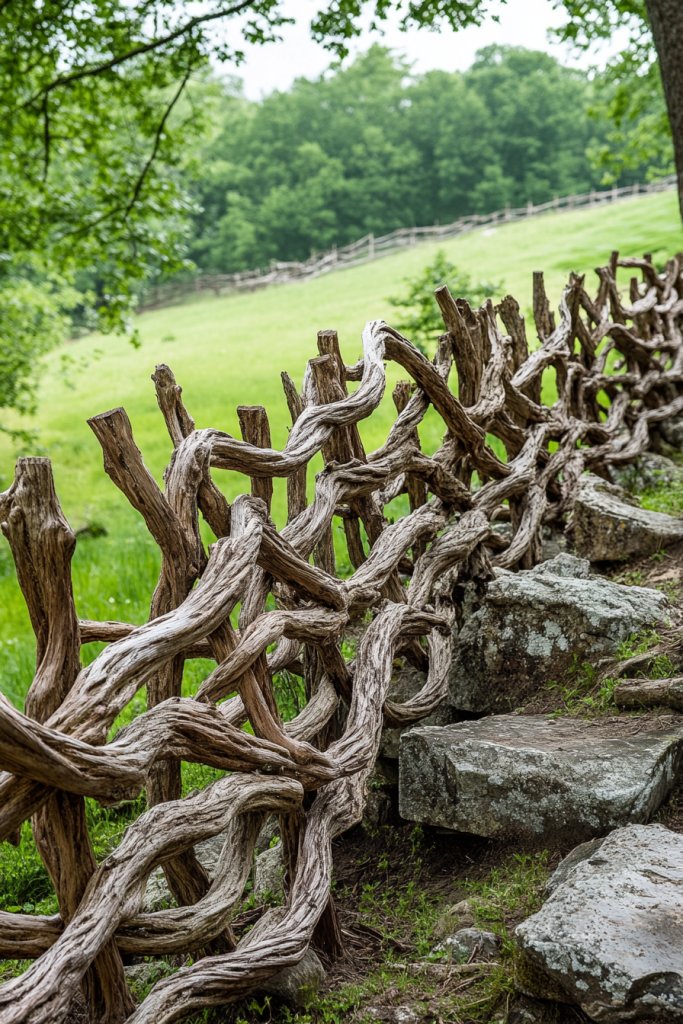 Visualize irregular, curving branches intertwined to form a sturdy barrier, each piece with its own twists and turns. The wood’s natural textures and knots add depth, while the uneven silhouettes evoke a sense of spontaneity. Gaps between branches allow glimpses of your garden beyond, blending privacy with openness. The overall look is rustic, artsy, and undeniably one-of-a-kind.