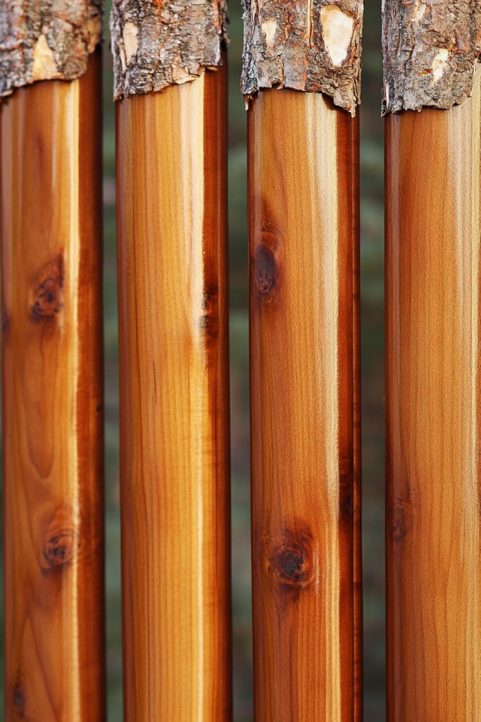 Imagine smooth cedar boards in rich honey or warm amber stains, showcasing the wood’s natural grain. At regular intervals, bark-covered posts and accents add a contrasting rugged texture. The combination creates a tactile experience, inviting touch and curiosity. Light bounces softly off the stained wood, highlighting the subtle variations in color and grain, while bark details introduce a wild, untamed element.