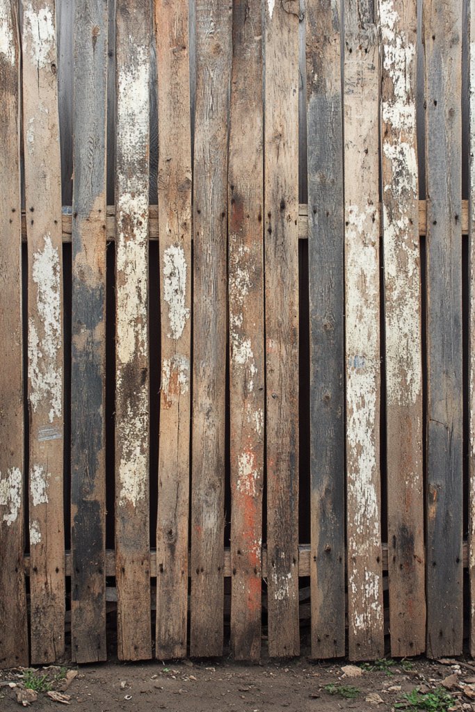 Picture a patchwork of weathered, paint-peeling wooden planks arranged vertically or horizontally. Each pallet piece carries its own story—scratches, knots, and faded colors that add charm. The uneven edges and distressed surface lend a relaxed, shabby-chic vibe. When assembled, the fence feels like a piece of reclaimed history, full of personality and imperfections.