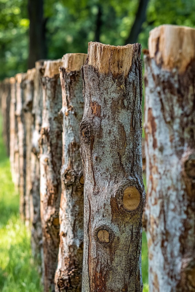Choose different types of logs—cedar, cypress, or pine—depending on your climate and aesthetic preference. For a more refined look, you can sand the logs lightly at the top, or leave them jagged for a wild look. Adding a clear sealant preserves the bark’s natural texture while protecting against weather. For a softer look, stagger the logs or vary their heights for visual interest.