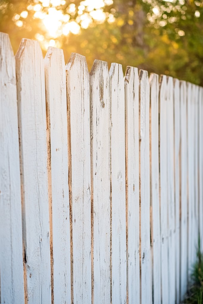 Visualize a fence coated in a soft, matte white or off-white finish, with the wood grain subtly visible beneath. The distressed look adds a touch of history, as if the fence has weathered many seasons. The light color reflects sunlight, making the yard appear larger and more open. Weathered edges and uneven paint application enhance its vintage appeal, giving it a timeless charm.
