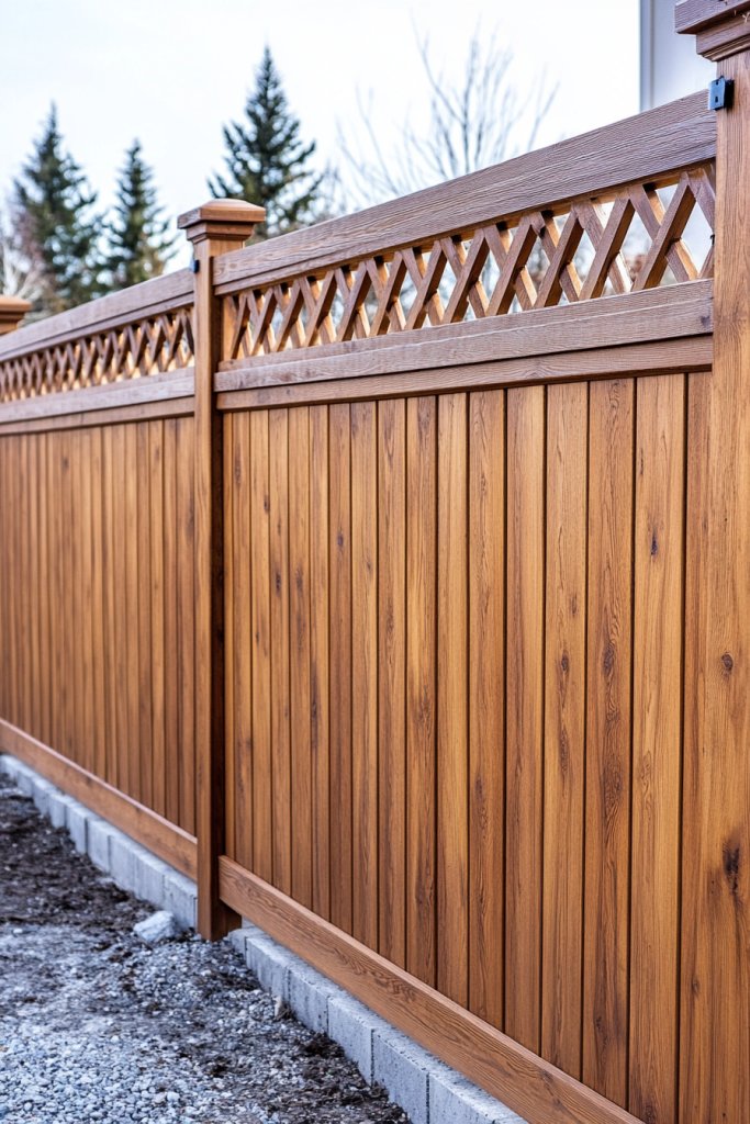 Picture a sturdy wooden fence with smooth, warm-toned slats, topped with a delicate crisscross lattice pattern. The lattice adds a decorative element that feels airy yet structured. Sunlight filters through the open triangles, casting intricate shadows on your patio. The natural wood finish highlights the grain, giving a warm, inviting glow that complements garden greenery.
